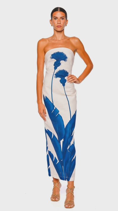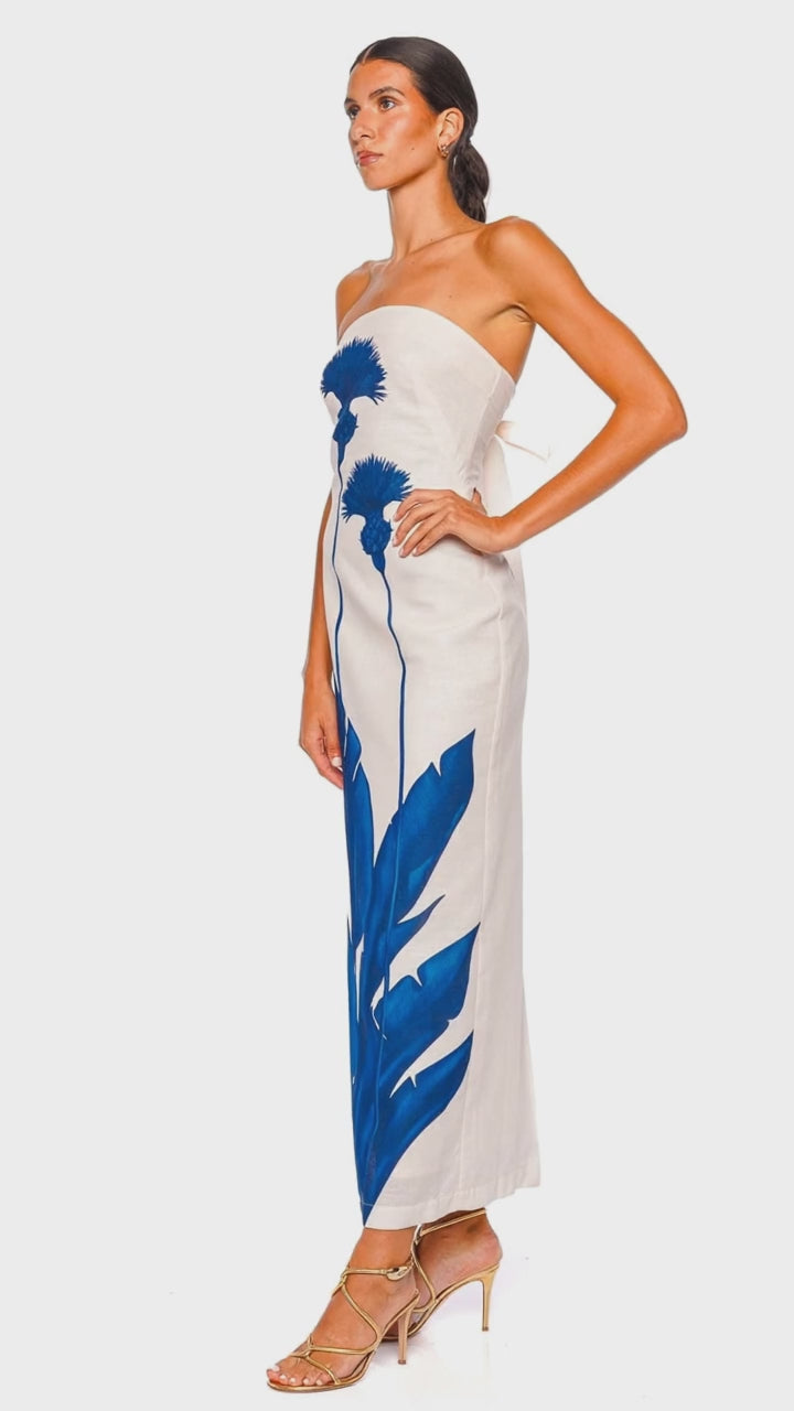 The Costera Blue Dandelion Strapless Maxi Dress embodies a captivating blend of sophisticated elegance and striking botanical beauty. This dress features a luxurious linen fabric that elegantly drapes to create a sweeping silhouette, accentuated by an exquisite dandelion print in vibrant blue. The strapless design adds a touch of contemporary sensuality, making it a perfect choice for both formal gatherings and upscale summer soirées. Complement this masterpiece with delicate jewelry and sleek high heels for a graceful, polished look.