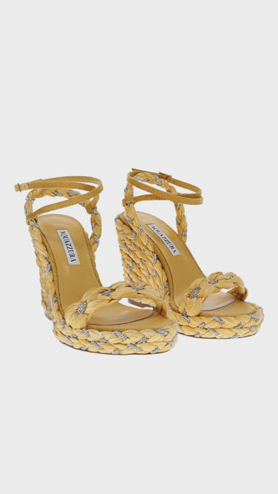Sparkling crystals enhance the earthy woven raffia of woven sandals elevated on a lofty wedge heel.