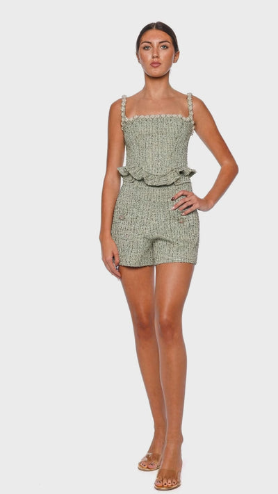 This opulent tweed top in a rich green hue pairs elegance with contemporary flair. Its structured silhouette is complemented by dazzling floral crystal embellished straps, adding a touch of glamour to any ensemble. Wear it for a luxurious, sophisticated look that transitions effortlessly from day to night. Pair with tailored shorts or a pencil skirt to complete the outfit.