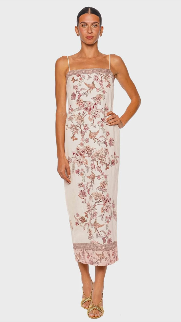 This refined midi dress features an ivory base adorned with intricate floral embroidery in soft blush and earthy tones, creating a timeless and artful effect. Delicate adjustable straps and a straight neckline lend understated elegance, while the tailored silhouette skims the body for a flattering, elongated look. Crafted from premium lightweight fabric, this piece exudes effortless sophistication for any occasion. Pair it with gold strappy heels and minimal jewelry for a polished, modern ensemble.