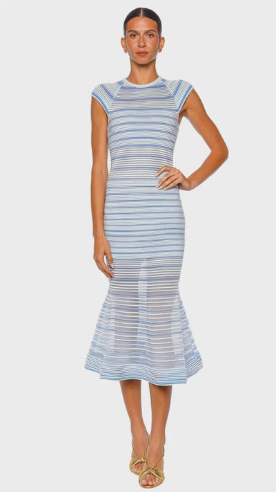 This refined knit midi dress features a captivating blend of periwinkle and multi-tonal stripes, lending a modern yet timeless allure. The cap sleeves and softly fitted silhouette create a flattering, elongated profile, while the flared hem adds a touch of playful sophistication. Crafted from a luxurious, breathable knit, this piece transitions effortlessly from day to evening. Pair it with metallic heels and minimalist jewelry for an effortlessly polished ensemble.