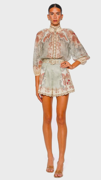 This luxurious blouse radiates a vintage charm with its exquisite wallpaper floral print in a serene mint hue. Crafted from premium ramie fabric, the garment exudes elegance through its intricate button detail and voluminous 3/4 sleeves. Perfect for both professional and social settings, this piece pairs effortlessly with high-waisted shorts or tailored trousers for a sophisticated touch. Opt for nude heels and minimalist jewelry to complete an elevated ensemble.