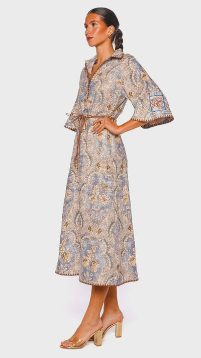 Embrace the timeless beauty of this Daylight Midi Dress featuring an intricate damask pattern in a subtle denim hue. Crafted with meticulous attention to detail, its flattering A-line silhouette is complemented by chic 3/4 sleeves and a delicate waist tie. Perfect for both day and night, this dress seamlessly combines elegance with contemporary design.
