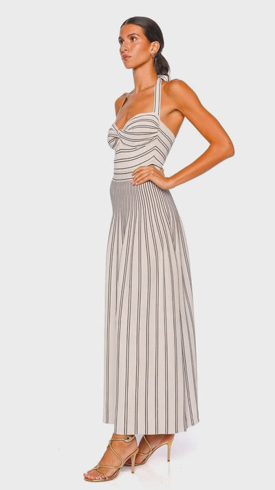 Elevate your wardrobe with the Daylight Twist Midi Dress, offering a captivating fusion of sophistication and modern style. The cream and black stripe pattern creates a striking contrast, enhancing the timeless appeal of its halter neck silhouette. Designed with a twisted bust detail, this dress exudes elegance and luxury, making it a perfect choice for both elegant daytime gatherings and chic evening affairs.