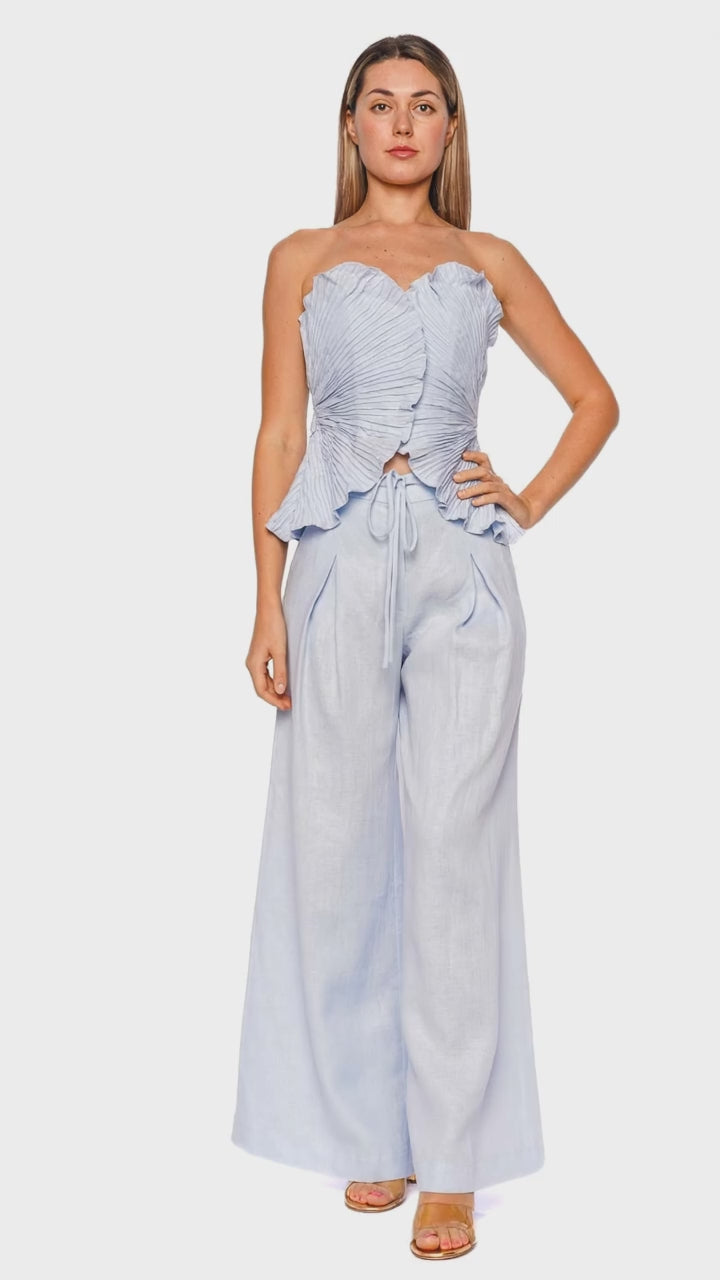 Capture the ethereal beauty of the De Tres Baby Blue Strapless Top, featuring an exquisite pleated design and scalloped edges. The delicate fabric and soft baby blue hue evoke a sense of timeless elegance and sophistication. With its unique silhouette, this top is perfect for elevating both casual and formal looks. Pair it with high-waisted trousers and strappy sandals for a chic summer ensemble.