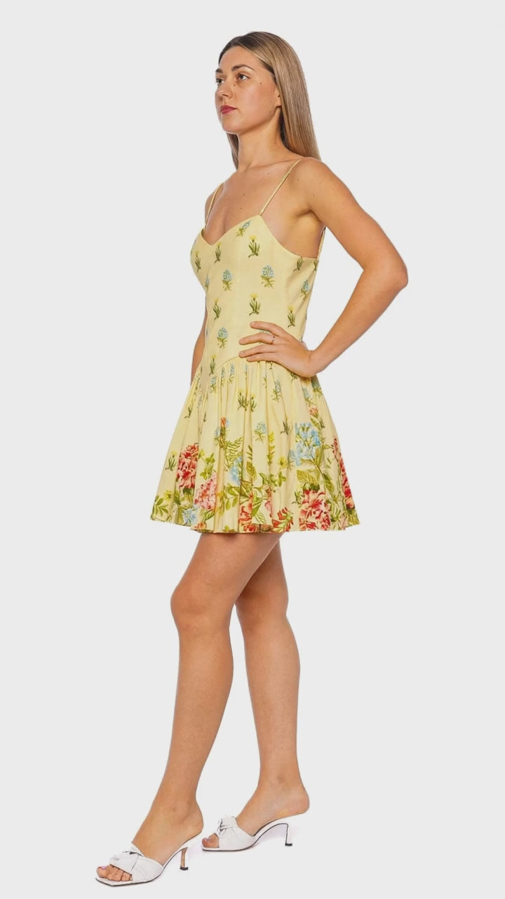 This floral mini dress features a sweetheart neckline and a fitted bodice that flares at the hip into a playful mini skirt.