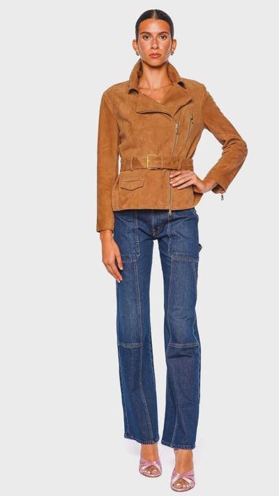 This luxurious biker jacket in a rich dark chai latte hue is crafted from sumptuous suede, offering both style and warmth. The standout belted waist enhances the silhouette, while the asymmetrical zipper and fine tailoring exude sophistication. Perfect for adding an edge to your ensemble, this jacket pairs beautifully with tailored trousers or a chic pencil skirt for an effortlessly polished look.