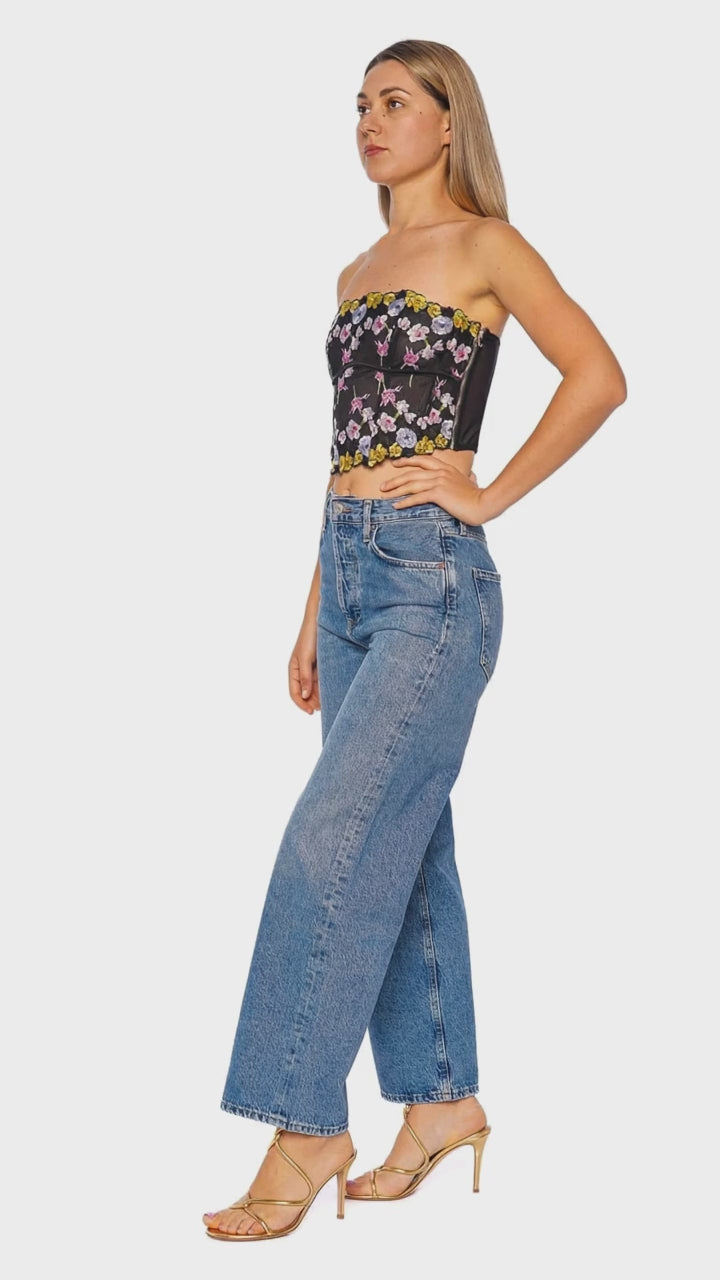 This strapless corset top features custom floral embroidery and flattering silk binding at the underbust.