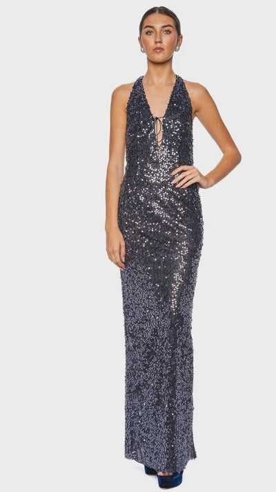 This dazzling halterneck gown is adorned with shimmering sequins throughout and features a dramatic plunging neckline, accentuating its bold and elegant design.