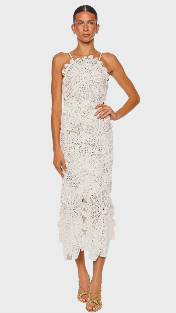 Indulge in artisanal luxury with this off white crochet midi dress, exquisitely crafted with intricate floral lacework for a captivating, romantic effect. The form-fitting silhouette, scalloped hem, and delicate adjustable straps strike a perfect balance between ethereal elegance and contemporary sophistication. Ideal for upscale soirées or summer celebrations, this statement piece guarantees a show-stopping entrance. Elevate with gold heels and pearl accents for a polished, high-fashion ensemble.