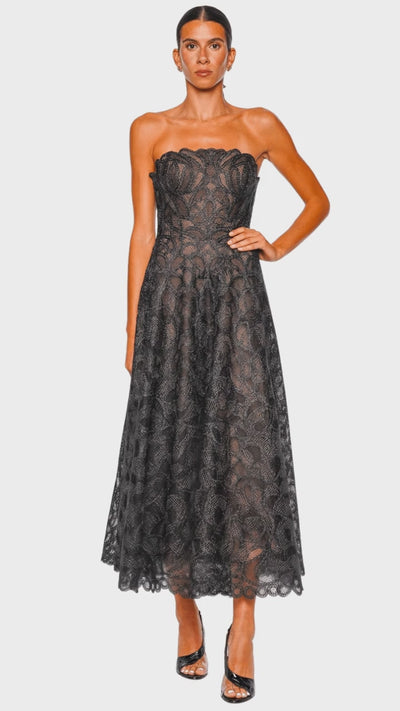 Elvina Black Lace Strapless Bustier Midi Dress