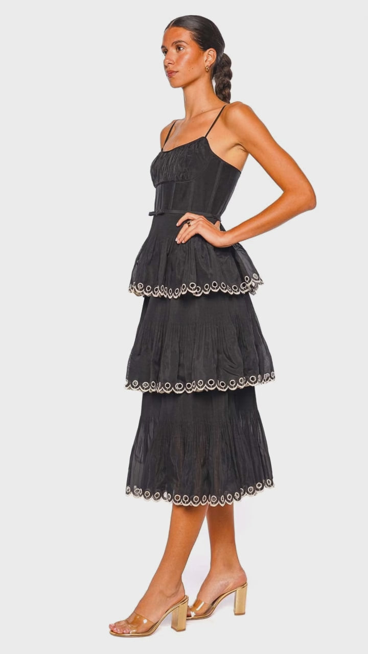 This stunning black midi dress features a sophisticated tiered design, adorned with intricate embroidery that exudes luxury. Crafted from high-quality fabric, this piece is designed to move gracefully with every step, making it perfect for elegant soirées or chic evening affairs. The delicate spaghetti straps and form-fitting bodice highlight your figure while providing a touch of modern allure.