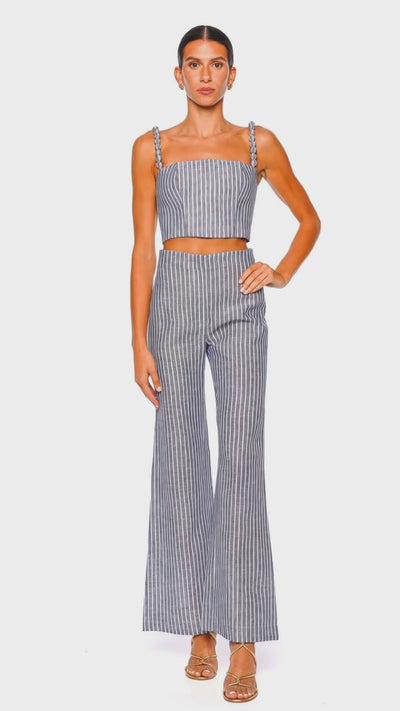 Exude nautical charm with this refined Esperame crop top, featuring a chic square neckline and a captivating white and blue striped pattern. This fitted piece is an exemplar of effortless elegance, with self-covered ball embellishments at the shoulder straps. Perfectly paired with high-waisted trousers or a flowy skirt, it elevates any ensemble with its sophisticated silhouette and attention to detail.