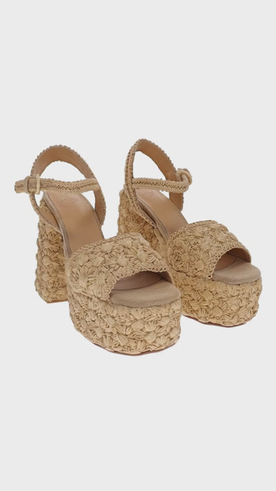 These espadrille platform heels are crafted from natural raffia hand-embroidered in a floral design.
