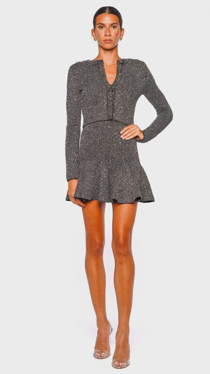 This chic long sleeve cardigan, exuding classic sophistication, is crafted from a premium fabric in a mesmerizing black hue. Its elegant long sleeves and cropped silhouette make it a refined choice for both daytime and evening events. The subtle shimmer throughout the fabric elevates its luxurious appeal, offering a timeless piece for your high-end wardrobe. Layer it over the matching mini dress for added warmth and pair with statement heels for a polished ensemble.