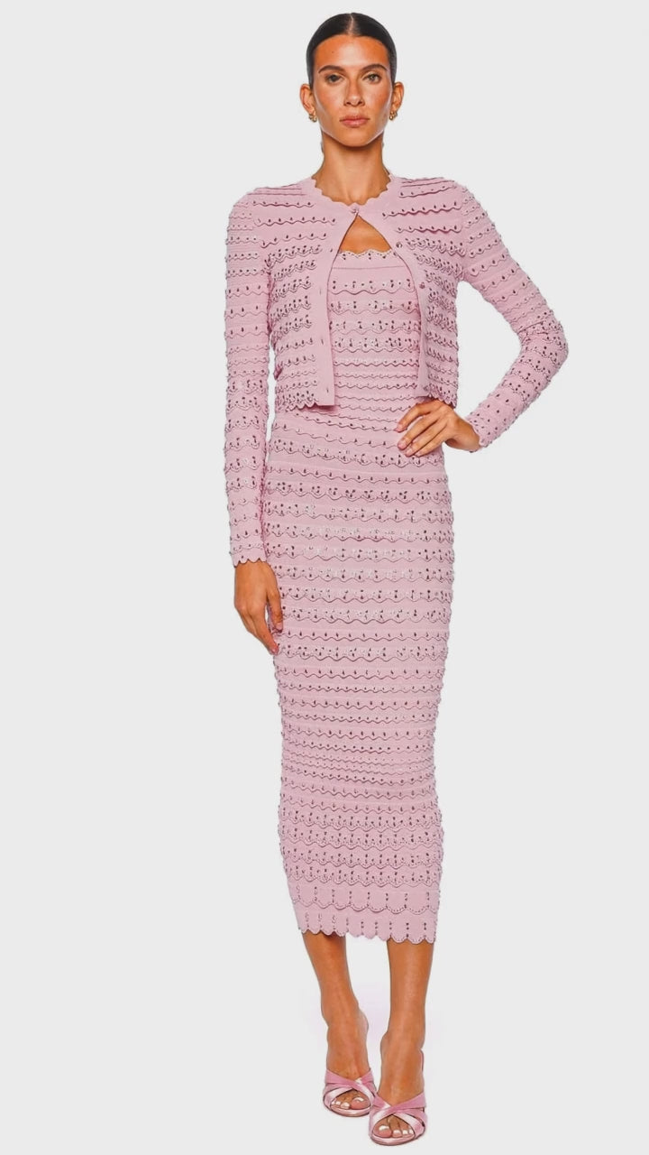 Cocoon yourself in the luxurious elegance of this Ferris Cardigan, a perfect harmony of comfort and style. In a delicate ballet slipper pink, the long sleeves and chic silhouette deliver both warmth and extraordinary elegance. This piece radiates sophistication with its intricate knit design, and is perfect for layering over a matching coordinate set for a refined ensemble.