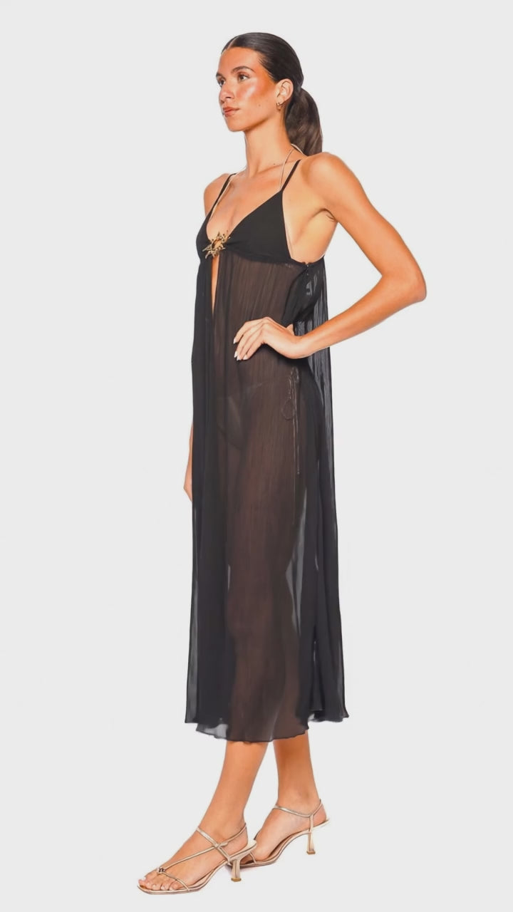 This ethereal midi dress is crafted from a sheer, pleated fabric, exuding a captivating elegance that's both modern and timeless. The alluring silhouette is designed with a delicate halter neckline and an open-back detail, perfect for sun-drenched escapades and luxurious evening ventures. With its breezy charm and high fashion finesse, this dress embodies the essence of effortless sophistication.