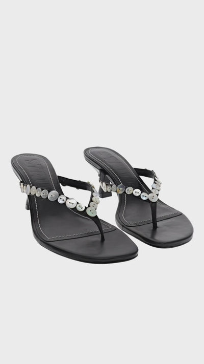 Elevate your footwear collection with the Freja Mother of Pearl Embellished Thong Kitten Heel. These sophisticated sandals feature a striking embellishment of mother of pearl buttons across the thongs, capturing the light with every step. Expertly crafted for both style and comfort, this pair embodies a harmonious blend of contemporary elegance and timeless chic. The low kitten heel is perfect for all-day wear, while maintaining an air of refined grace.