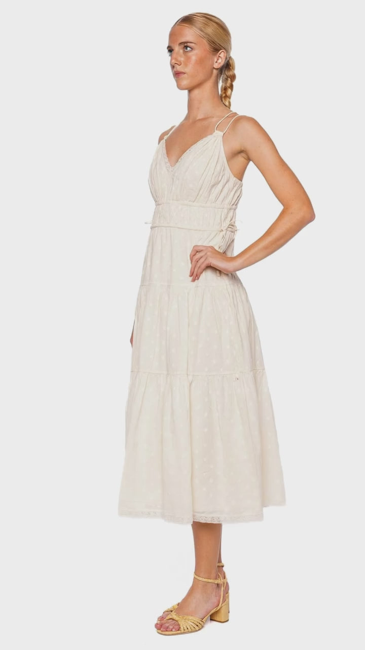 This midi dress is cut from soft and lightweight cotton dobby that’s delicately adorned with clipped dots. This V-neck style has dual straps that elegantly crossover at the back, and an elastic waist with drawstrings you can adjust to your frame.