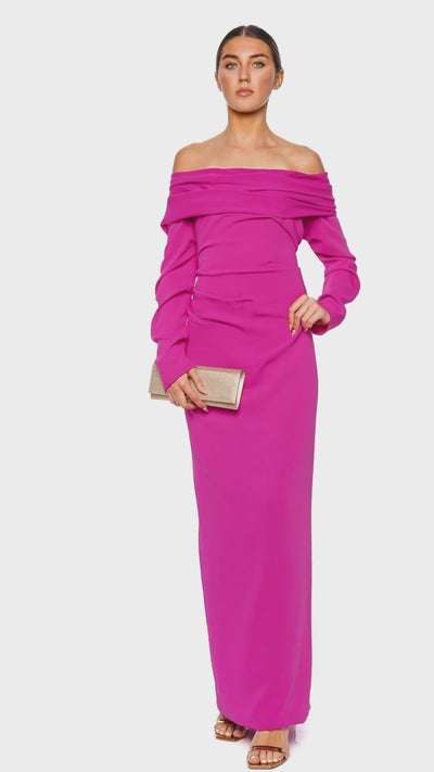 This long sleeve crepe gown features an off-shoulder neckline and a draped design in the bodice for a flattering fit.