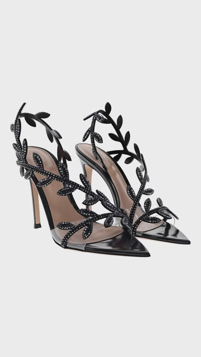 Crafted from suede and enriched with precious crystals, Crystal Flavia is a pointed-toe asymmetric sandal with a 105mm stiletto heel. The upper presents a laser-cut leaf motif and a front toe band in soft see-through Plexi.