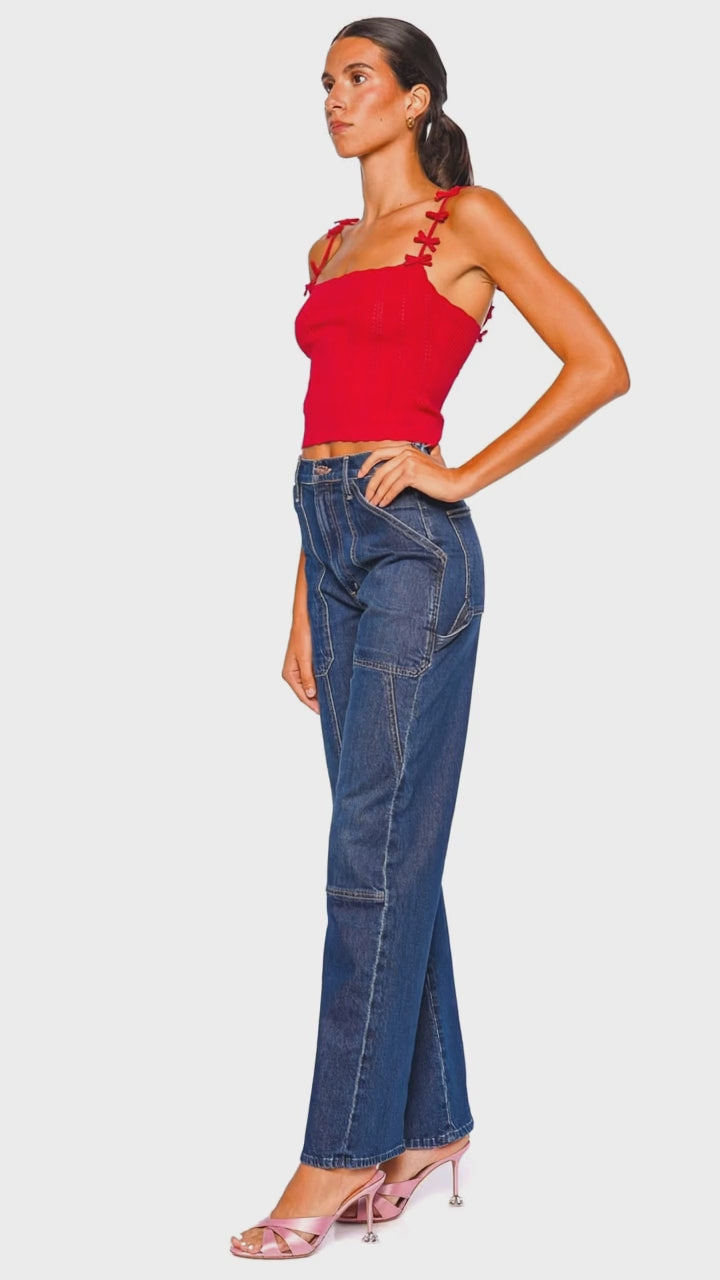 This vibrant candy apple red top offers a sweet blend of playful charm and modern allure. Crafted from a luxurious knit, its figure-enhancing silhouette is accentuated by delicate bow details along the straps, adding a delightful touch to its sophisticated design. Perfect for transitional weather, this top combines comfort and style effortlessly. Pair it with tailored denim and the matching cardigan for an elegant daytime look.