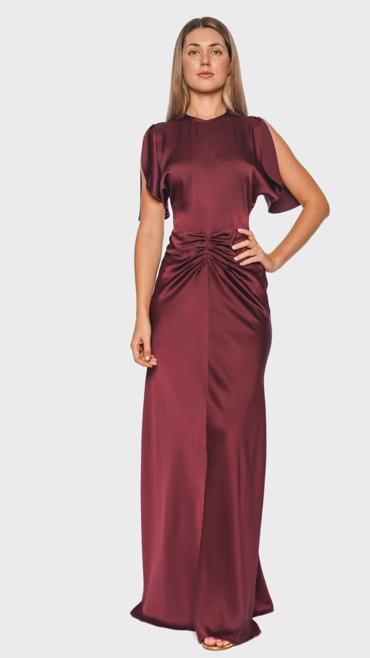 This luxurious floor length dress in cinnabar red exudes elegance with its sumptuous satin-like finish and gracefully gathered waist. The sleek silhouette features chic short sleeves with stylish opening details, gracefully draping to enhance its sophisticated allure. Perfect for an enchanting evening affair, this dress promises to make a striking impression. Elevate its charm with statement jewelry and strappy heels for a captivating look.