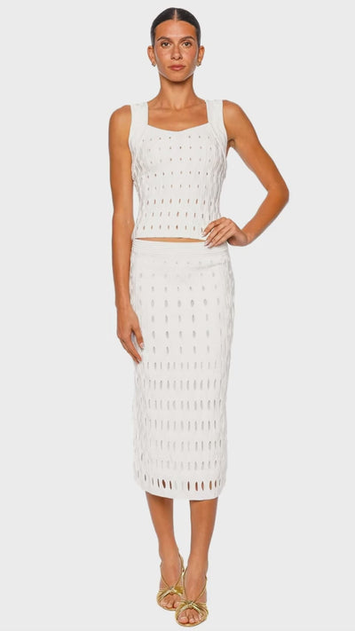 This luxurious ivory knit tank top is crafted with a modern, textured openwork pattern for a striking yet refined effect. Its wide straps and fitted silhouette offer a sophisticated update to a timeless staple, perfect for layering or wearing on its own. The premium fabric and intricate detailing make this piece equally suited for elevated daywear or chic evening looks. Style it with the matching knit skirt and gold accessories for an effortlessly polished ensemble.
