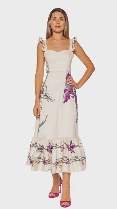 This Italian cotton midi dress features a sweetheart neckline framed by ruffled straps and a floral placement print. Cinched at the waist and then flares into a fluid tiered skirt.