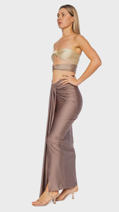 The Giselle Terra Strapless Maxi Dress embodies sophistication with its flowing silhouette and sumptuous fabric. This dual-tone bandeau top cascades into a sleek maxi skirt, accentuating your figure with its artful draping. The exquisite terra color adds a touch of warmth, making it an ideal choice for both sultry evenings and upscale gatherings.