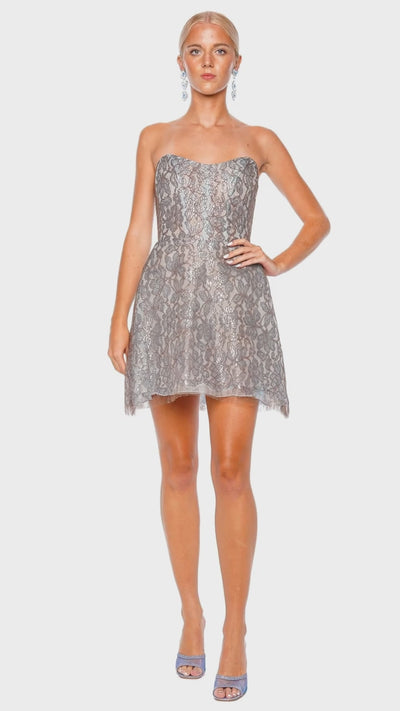 This strapless lace mini dress features a sweetheart neckline with a fitted bustier bodice,