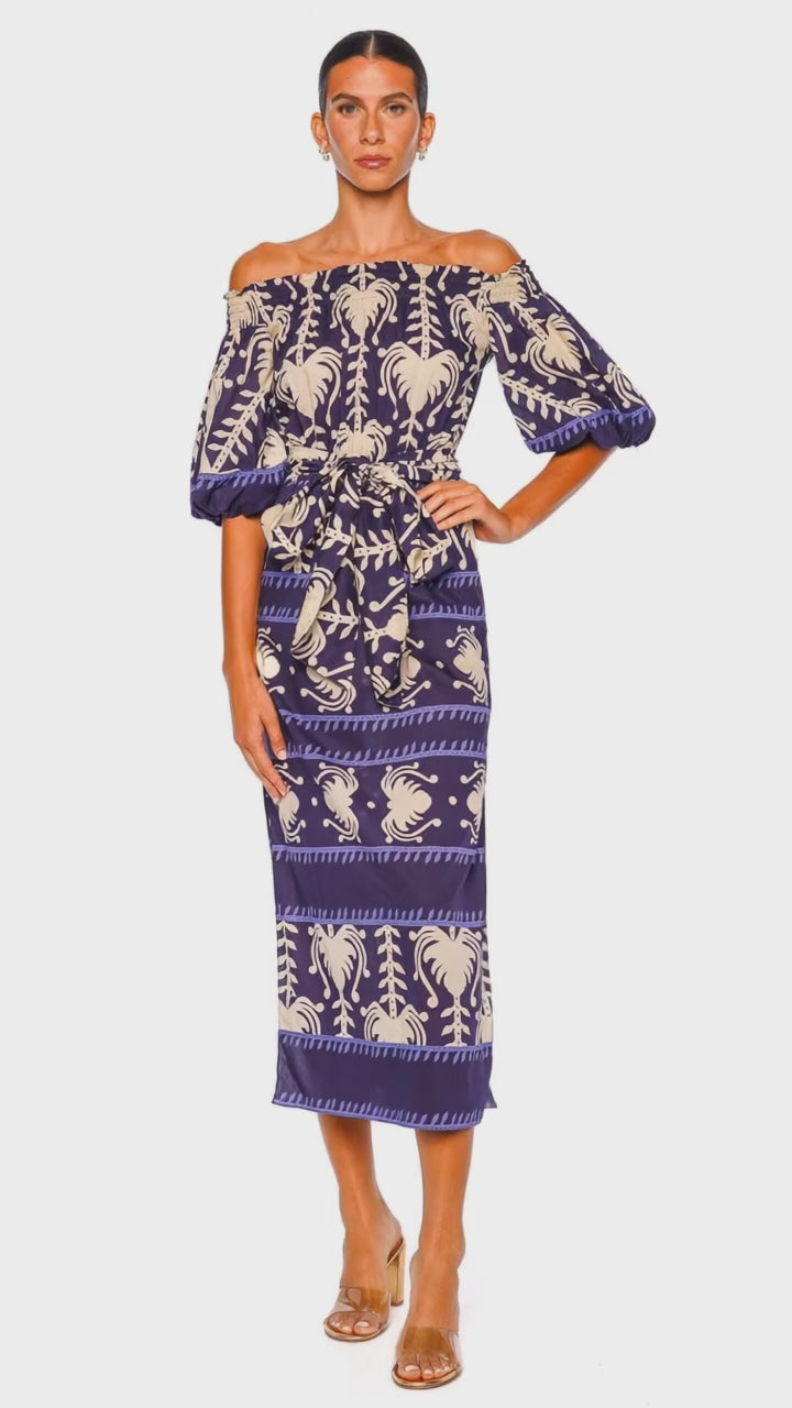 Embrace the art of refined elegance with this stunning off-shoulder ankle dress. Crafted from premium materials, its enchanting navy and ecru pattern exudes a sense of timeless sophistication. Featuring a belted waist and voluminous sleeves, the dress is perfect for making a bold yet elegant statement. Style it with nude heels and minimalistic jewelry for an effortlessly chic look.