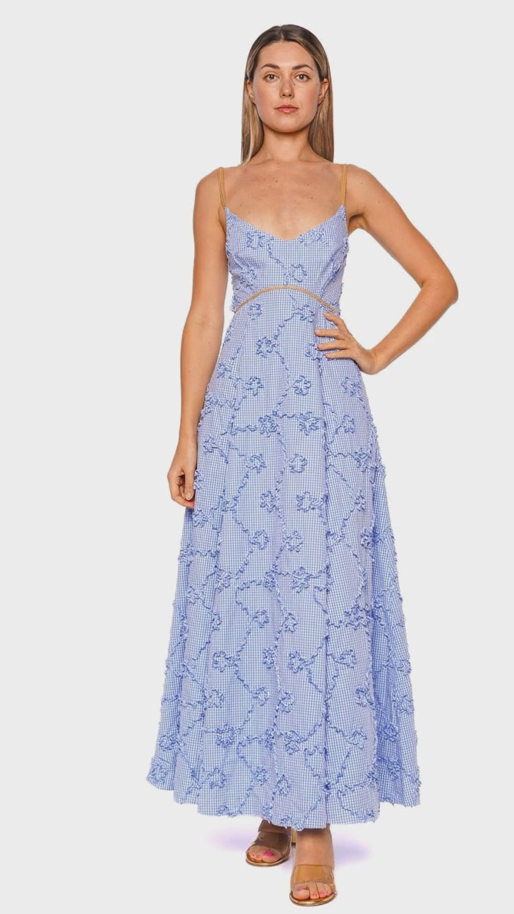 Harlow Blue Gingham Floral Embroidered Maxi Dress