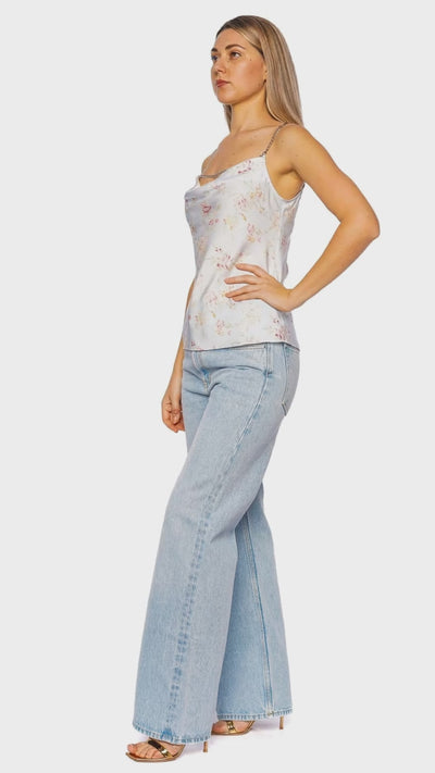 This floral cami top features a cowl neckline with silver-tone chain detailing.