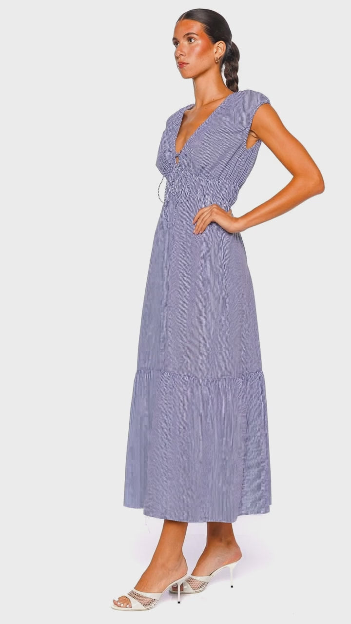 Hedda Navy Stripe Gathered Cotton Midi Dress