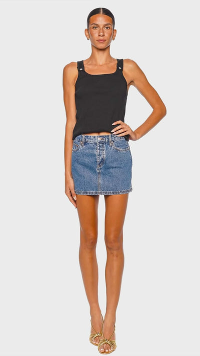 The Holly Skirt in Classic Blue is a refined take on the iconic denim mini, cut in a clean high-rise silhouette that flatters and elongates the leg. Crafted in structured classic-wash denim with contrast topstitching, it delivers polished edge with everyday ease. Finished with a timeless five-pocket design, it transitions seamlessly from daytime chic to after-dark cool. Pair it with a sleek bodysuit and strappy heels or a crisp button-down and loafers for an elevated off-duty look.