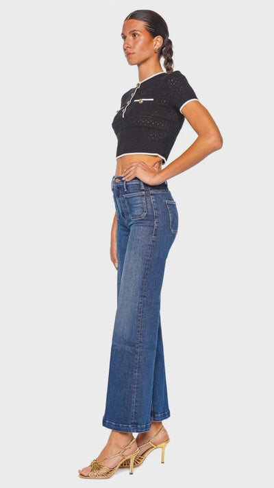 Elevate your denim collection with these effortlessly chic wide leg jeans in a rich medium blue wash. Crafted from premium denim, this style features signature patch pockets and a flattering high-rise silhouette that elongates the legs. The clean, tailored finish and subtle fading bring a touch of vintage-inspired sophistication, making these jeans a versatile staple for any wardrobe. Pair them with a sleek blouse and heels for a refined daytime look or a fitted knit top for evening elegance.