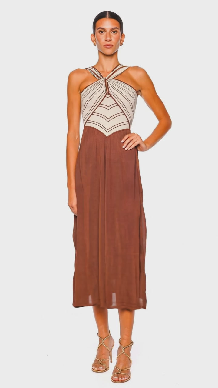 Elevate your wardrobe with the Hypnotic Cream and Tan Halter Midi Dress, a striking blend of elegance and modern design. Luxuriously crafted with a sophisticated halter neckline, this dress descends into a flowing midi silhouette that flatters beautifully. The unique cream and tan pattern adds a chic touch, making it the perfect choice for upscale events and gatherings. Pair it with strappy heels and minimalist jewelry for an effortlessly polished look.
