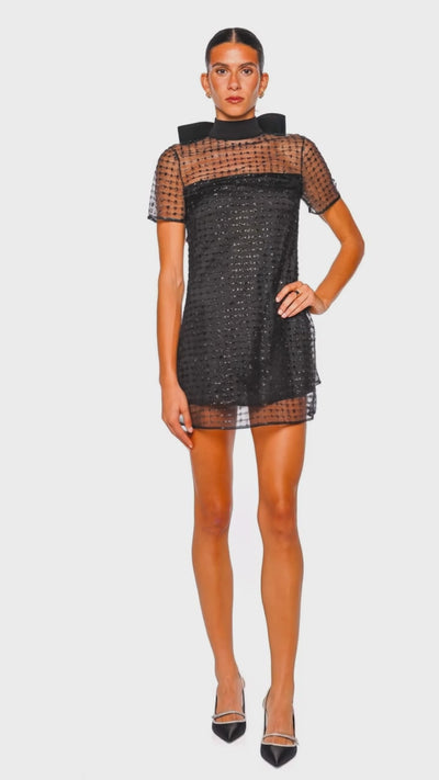 The Ilana Stardust Onyx Mini Dress is a captivating blend of timeless glamour and modern elegance. Its sheer tulle overlay is adorned with delicate stardust motifs, offering a subtle glimmer against the luxurious onyx background. The dress features a chic high neck with an oversized bow detail at the back, adding an element of playful sophistication. Perfect for cocktail parties or elegant soirées, pair this dress with minimalistic heels and statement earrings for a refined yet stylish ensemble.