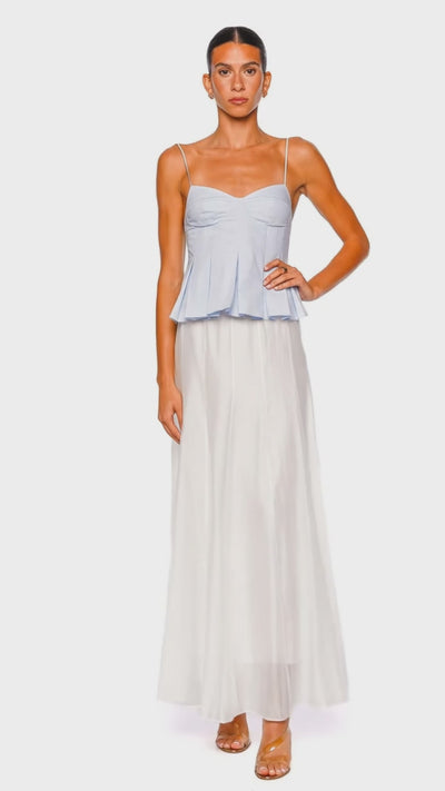 The Iris Pleat Camisole Top captivates with its delicate pleating and luxurious blue tint, offering a refined and sophisticated look. Skillfully crafted from sumptuous fabric, this elegant top is perfect for both upscale daytime ensembles or chic evening gatherings. Pair with tailored trousers or a flowy skirt for an effortlessly elegant outfit.