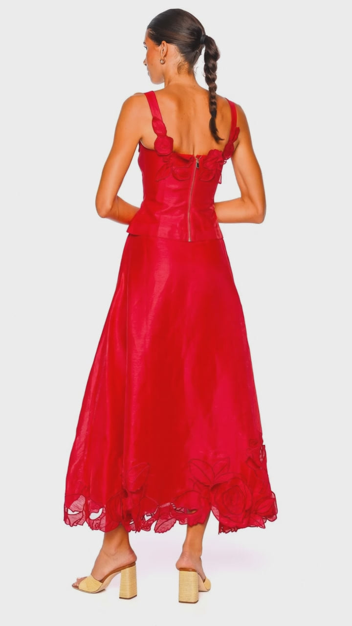 Introducing the Isadora Scarlet Applique Top, a piece that embodies luxury and intricate craftsmanship. This exquisite top features delicate appliqué detailing, creating a captivating and romantic aesthetic. The rich scarlet hue enhances its sophisticated allure, making it ideal for grand occasions or stylish pairings. Style with a matching scarlet skirt or tailored white trousers for a chic ensemble.