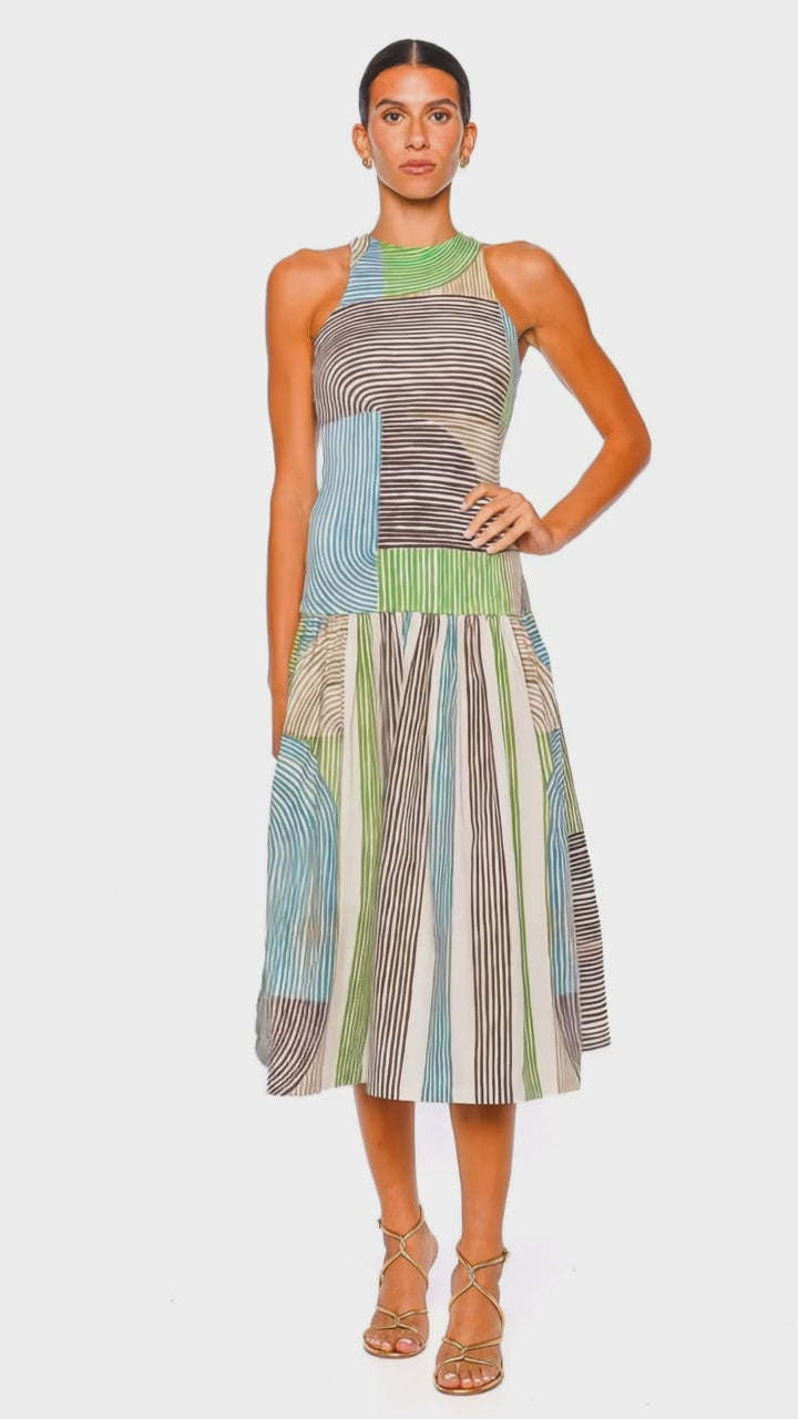 Experience a bold fusion of art and fashion with the Jamelia Abstract Green Sleeveless Midi Dress. This striking piece, featuring an eclectic blend of geometric patterns and vibrant hues, is perfect for making a statement at any stylish affair. The form-fitting drop waist bodice complements the flowing midi skirt, offering an effortlessly chic silhouette ideal for summer soirées.