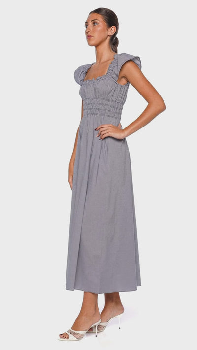 Experience vintage charm with the Janne Midi Dress, exquisitely crafted in a classic navy gingham with a modern twist. The frilled sleeves and shirred bodice beautifully accentuate the figure, offering both elegance and comfort. This timeless piece is perfect for warm-weather outings, effortlessly combining sophistication with a playful silhouette. Complete the look with white strappy sandals and a simple clutch for a polished daytime ensemble.
