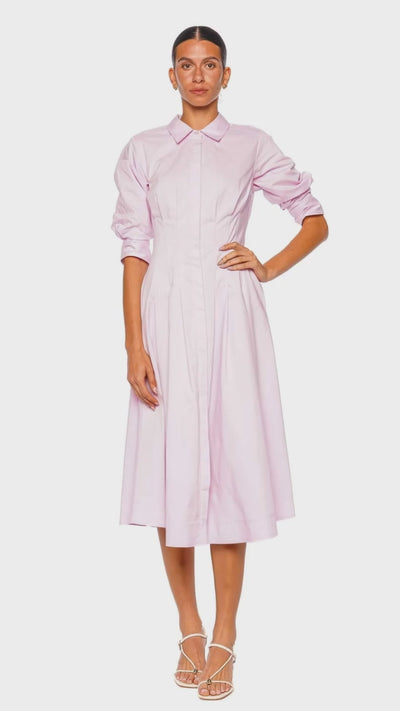 Exuding refined elegance, this midi dress captivates with its soft tulip pink hue and tailored pintuck detailing. The crisp cotton fabrication and structured collar lend a sophisticated touch, while the long sleeves and feminine silhouette make it effortlessly chic for any occasion. Perfect for garden parties or elevated daytime affairs, this versatile piece pairs beautifully with strappy heels and minimalist accessories for a polished look.
