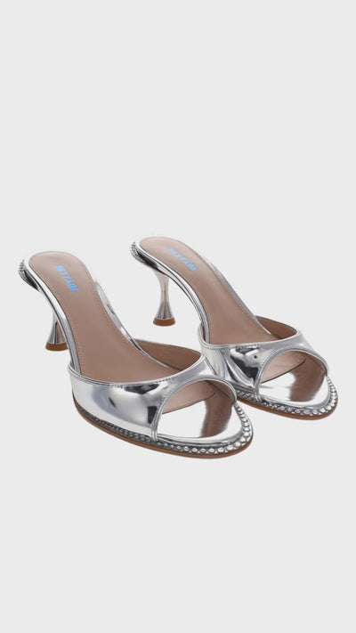 This slip on kitten heels are crafted from silver metallic leather creating a mirror effect. This style is elevated with crystal trim embellishment.