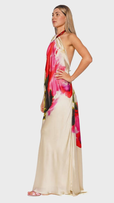 Embrace sophisticated elegance with the Jesse Azalea Flower Halter Maxi Dress, featuring a luxurious satin finish with vibrant floral prints. The halter neck design and flowing silhouette exude a timeless grace, perfect for making a statement at any upscale event. This ethereal piece combines comfort and style, delivering a captivating yet refined look.