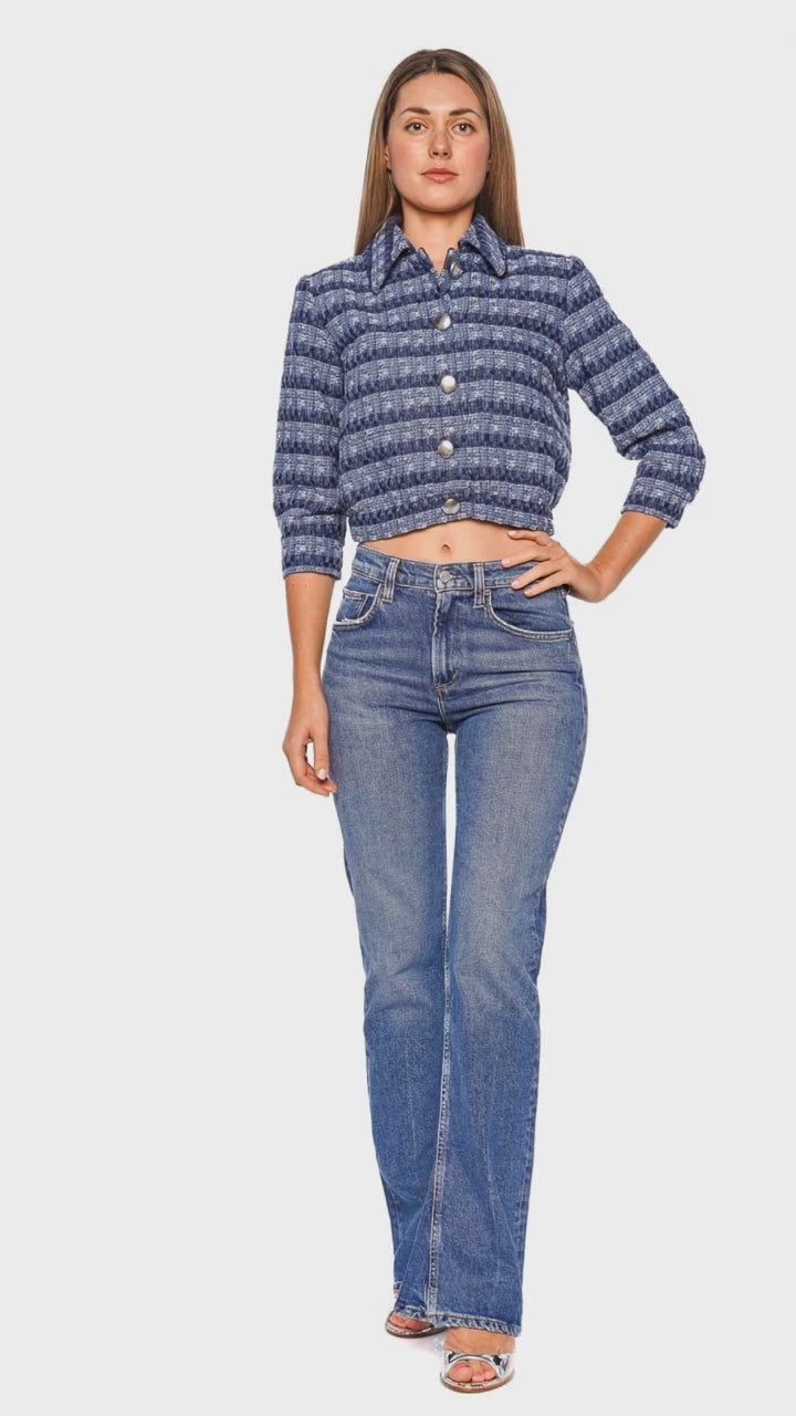 Embrace chic sophistication with this Jia cropped jacket, crafted from a luxurious blue multi-stripe tweed. The structured design features distinctive metallic buttons and a flattering three-quarter sleeve, ideal for adding a touch of elegance to your ensemble. This statement piece is perfect for transitioning seamlessly from day to night, offering versatile styling options. Pair it with high-waisted jeans and sleek heels for an elevated casual look.