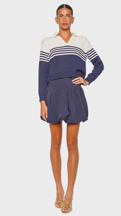 This luxurious knit polo top features a sophisticated midnight blue and ivory stripe design, expertly crafted for a refined yet sporty aesthetic. The soft, premium knit fabric and structured collar elevate the classic silhouette, while the cropped cut adds a modern edge. Perfect for layering or wearing on its own, this piece effortlessly transitions from casual daytime outings to chic evening gatherings. Pair it with tailored trousers or a voluminous skirt for a polished, on-trend look.