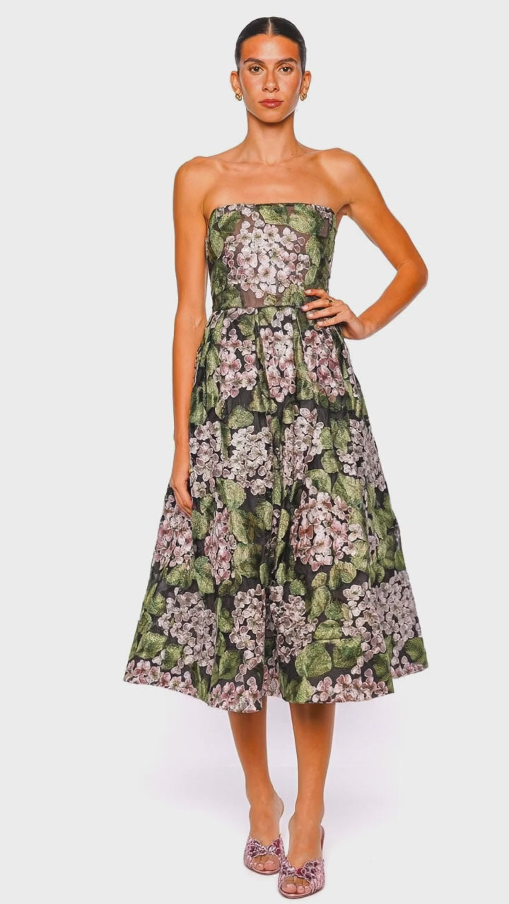 Revel in the beauty of this exquisite strapless midi dress, adorned with intricate floral embroidery that adds a touch of whimsy to its sophisticated silhouette. The luxurious fabric melds comfort with elegance, making it perfect for both glamorous soirées and upscale garden parties. This statement piece embodies modern femininity and timeless grace.