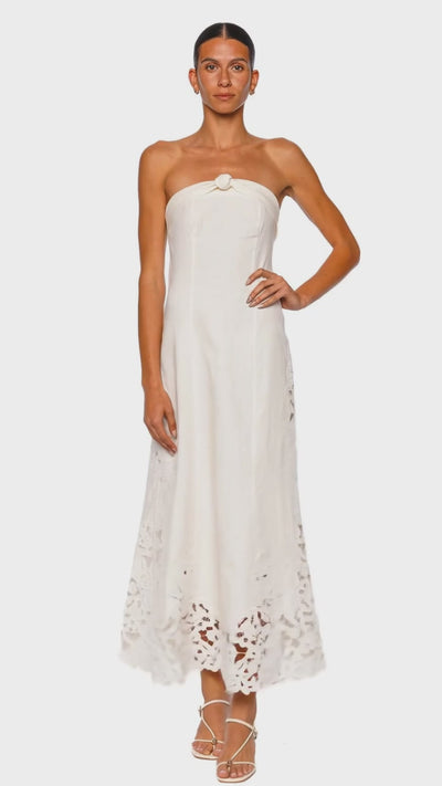 This elegant off white midi dress features a strapless silhouette with a chic knotted detail at the bust, exuding effortless sophistication. Crafted from luxurious, breathable fabric, it drapes gracefully over the body and boasts exquisite floral cutwork embroidery along the hemline for a touch of romance. Perfect for summer soirées or refined daytime events, this piece is the epitome of modern femininity. Pair with strappy heels and minimal jewelry for a strikingly polished look.